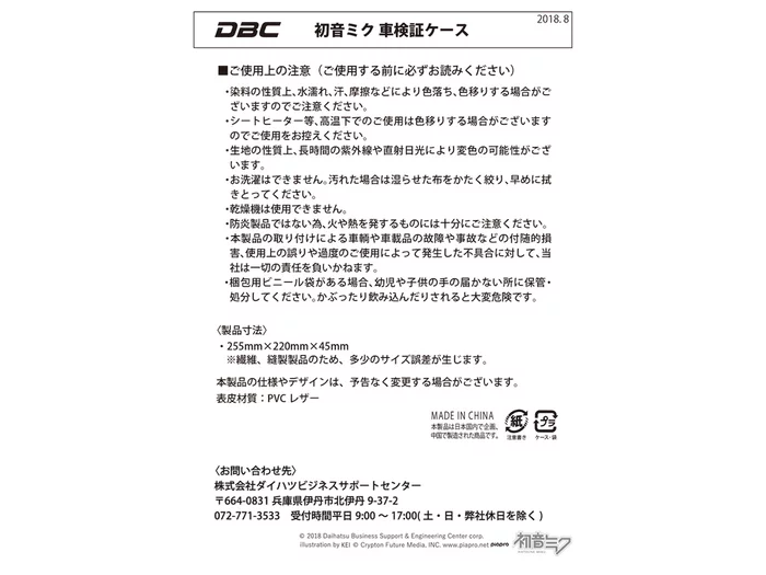 Hatsune Miku has collaborated with Daihatsu for their new limited package Hatsune Miku Move Canbus, and to celebrate DBC is releasing a special line of products that includes car accessories, apparel, and more! Keep your car registration, owner’s manual, and insurance paperwork organized in style with this special case. The flip case fastens with a popper and is styled to incorporate Miku’s turquoise and black color scheme along with her tie and “01” on the front. Also included is a handy strap so you could even use it as a small everyday bag.