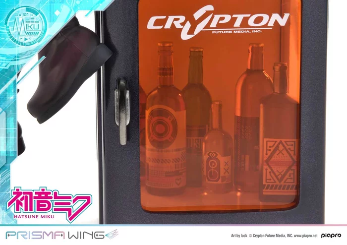She is posed sitting atop a Crypton Future Media branded liquor cooler as she glances to the side and gives a warm smile. She features meticulous sculpting and detail down to the different textures of her outfit, and her long twintails have been recreated using translucent materials for a light, ombre look toward the tips. Each bottle inside the cooler has even been individually detailed to fully capture the charm of the original artwork. Don’t miss out on adding this unique Miku figure to your collection!